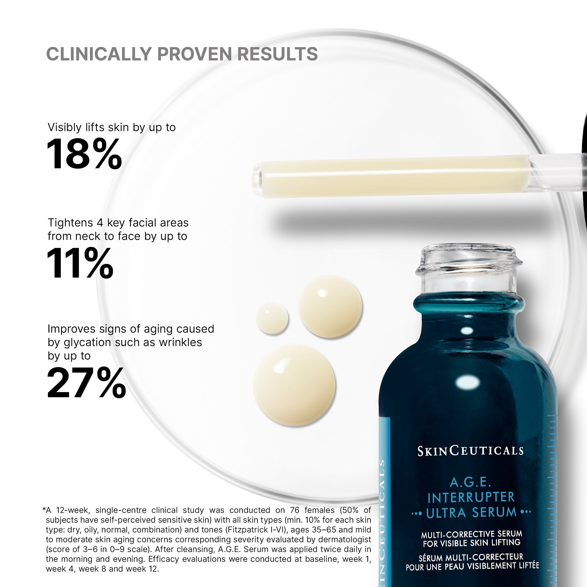 A.G.E. Interrupter Ultra Serum is a multi-patented lifting serum that stimulates collagens in all layers of the skin to resculpt & rejuvenate. With a high concentration of Flavo-proxylane, it tightens key areas from neck to face and reduces noticeable signs of aging linked to Advanced Glycation End-products (A.G.E.), such as wrinkles, by up to -27%.